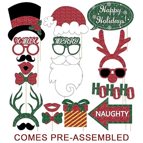 Real Glitter Christmas Photo Booth Props Kit Large Size No Diy Required 21pcs Funny Christmas Party Supplies