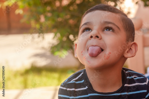 Little Boy Contorts His Face At Outdoors 6 Years Old Kid In